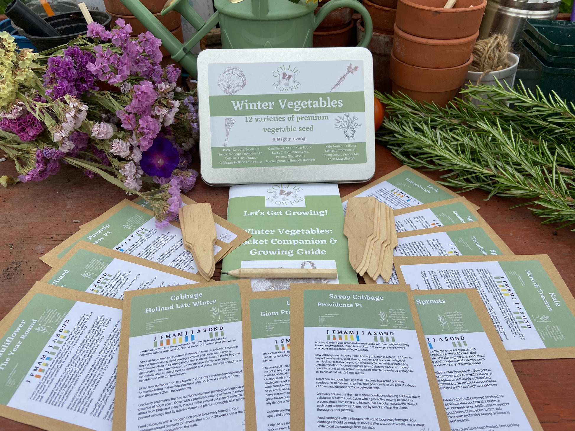 12 packs of seed, Brussel Sprouts, 2 types of cabbage, Cauliflower, Celeric, Chard, Kale, Leeks, Parnsip, Purple Sprouting Broccoli, Sprinah and Spring Onions specially selected by Collie Flowers